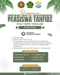 STAI YAPIS Takalar, Sekolah Tinggi Agama Islam (STAI) YAPIS Takalar resmi membuka pendaftaran salah satu program beasiswa, yaitu Beasiswa Tahfidz Tahun Akademik 2025/2026. Program ini diperuntukkan bagi calon mahasiswa maupun mahasiswa yang memiliki kemampuan dan komitmen dalam menghafal Al-Qur’an.